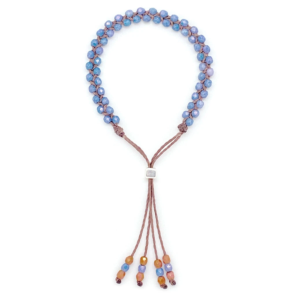 Faceted Czech glass beads are tightly woven into a very durable and waterproof cording with decorative tassel detail. Full adjustable with metal bead cinch closure. Dainty and super strong and water friendly. Made in USA.